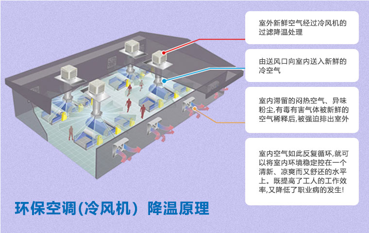 在空氣不流通的環(huán)境中,尤其是化工車間,容易產生建筑綜合癥,如悶熱、頭疼、眩暈、過敏、咳嗽等不適癥狀。使用環(huán)??照{(冷風機)通風降溫方案即可以有效降溫,又能保證空氣流通